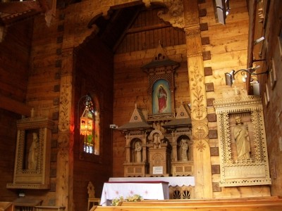 Główny ołtarz kaplicy wykonany został w formie frontowej ściany chaty góralskiej w większości z drewna jesionowego i jaworowego.