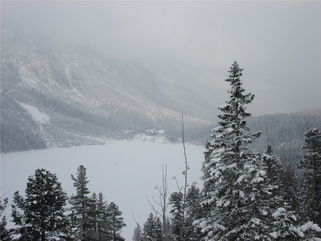 Natomiast wszystko rekompensują nam widoki po wyjściu ze schroniska nad brzeg jeziora. Morskie Oko zamarznięte, przysypane warstwą śniegu a w tle ośnieżone szczyty górskie. Jeżeli jest słońce widoki są naprawdę bajkowe i można zrobić świetne zdjęcia, w przypadku mgieł lub śniegu widoczność jest mocno ograniczona.